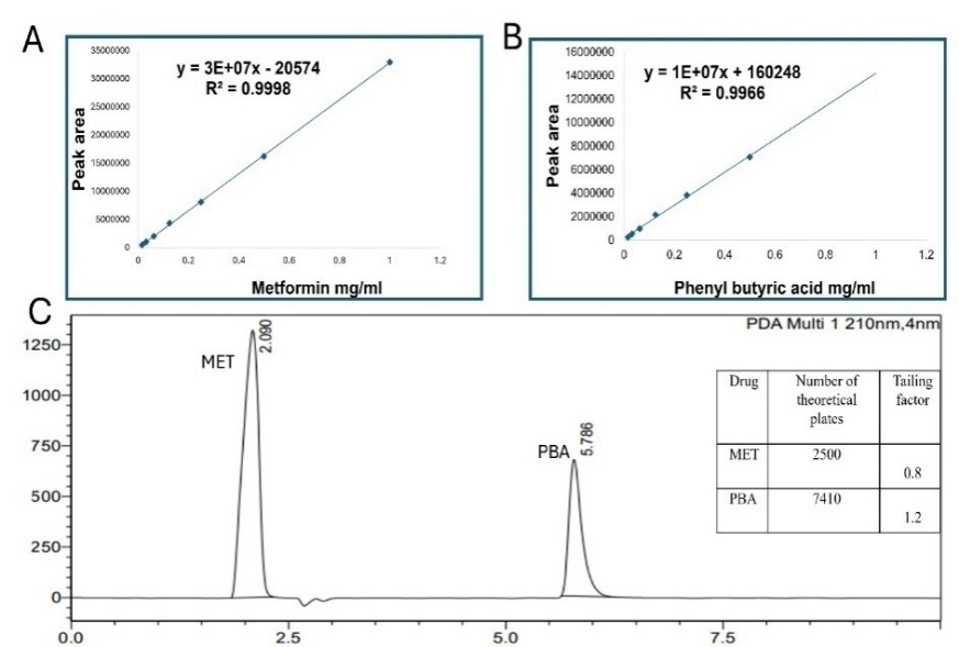 Fig. 5: HPLC Calibration of metformin (A) Phernyl butrric acid (B) HPLC chromtogram (C) (each experiment was done three times, mean±SD n=3)