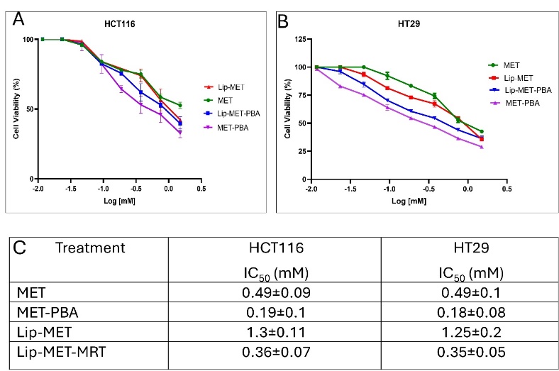 Fig. 6: The dose-response curve for HCT116 (A) HT29 (B) colorectal cancer cells treated with MET, MET-PBA, Lip-MET, and Lip-MET-PBA (0.4-1.5 mmol, n=3) (C) Summary table of IC50 for all formulations (each experiment was done three times, mean±SD, n=3)