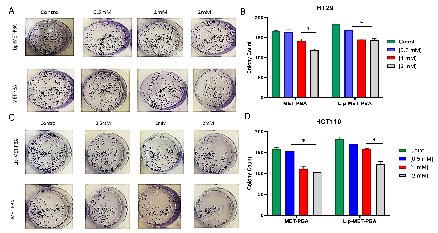 Results: The liposomal formulation showed encapsulation efficiencies of 48% for Lip-MET and 56.8% and 83.9% for Lip-MET-PBA. Sustained release profiles were observed, with 60% of MET and 55% of PBA released over 72 h. Cytotoxicity assays revealed that Lip-MET-PBA significantly reduced cell viability in HCT116 and HT29 cell lines, with IC50 values of 0.65 mmol and 0.82 mmol, respectively, compared to MET alone (1.1 mmol and 1.3 mmol). Colony formation assays demonstrated a concentration-dependent reduction in colony numbers, highlighting the enhanced anticancer efficacy of the combination. Statistical analysis showed significant differences (p<0.05) in cell viability and colony formation between the liposomal formulation and the free drugs.