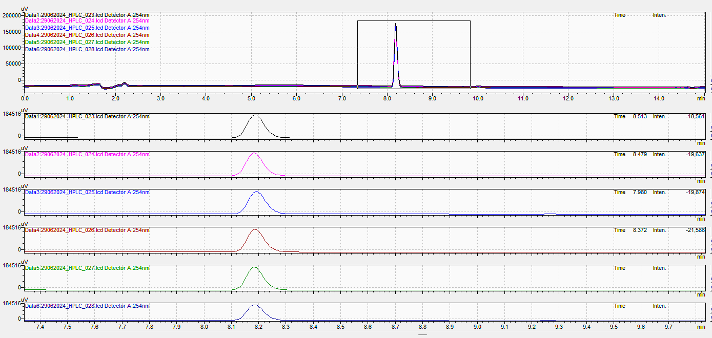 Maintenance of the Shimadzu LC-2050C System for reproducibility is carried out routinely. The pump seals, check valves, and tubing connections were intact, and no signs of wear or leaks were observed. The system provided a stable flow rate. The flow cell was cleaned periodically. All the solvents used in the mobile phase are filtered through a 0.45 µm filter.