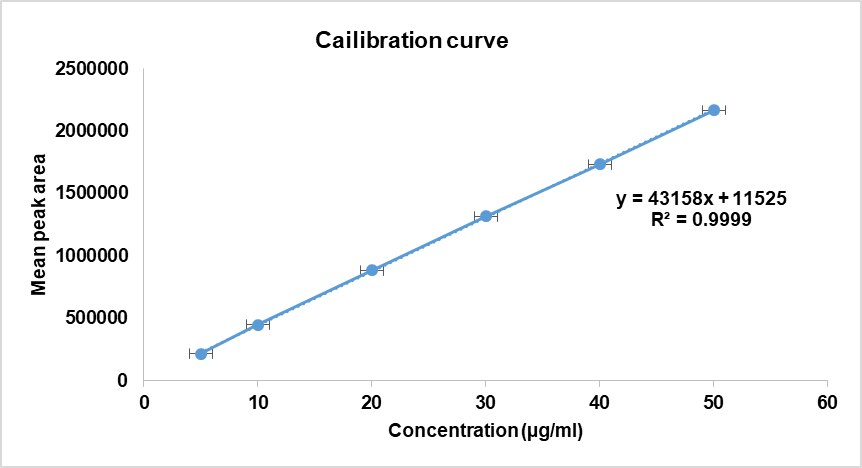 The developed method's linearity was entrenched at a concentration range of 10-50μg/ml. A series of solutions with concentrations ranging from 10 to 50μg/ml were prepared from the standard stock solution. Three injections of each level were injected into the chromatographic system using a 10μl fixed loop system, and chromatograms were recorded. The peak area versus concentration calibration curve was plotted, and the correlation coefficient was calculated.