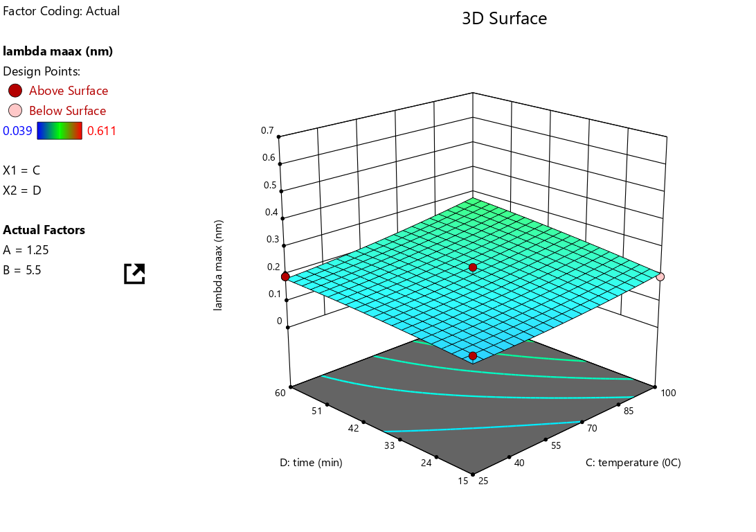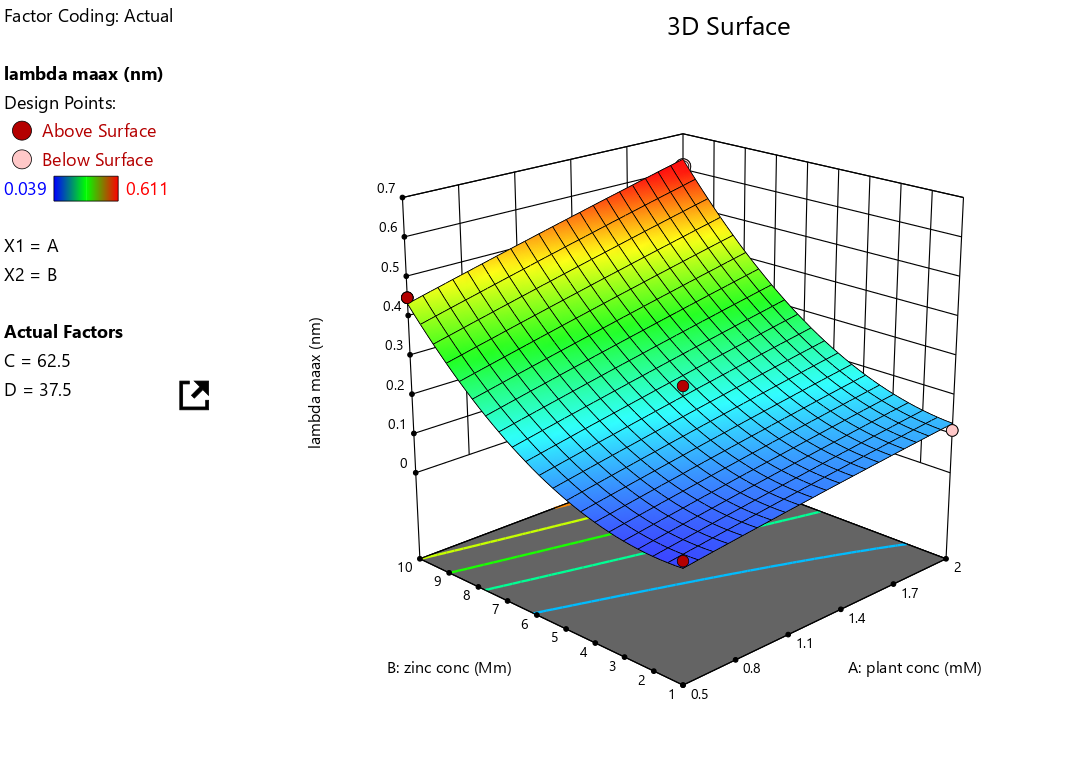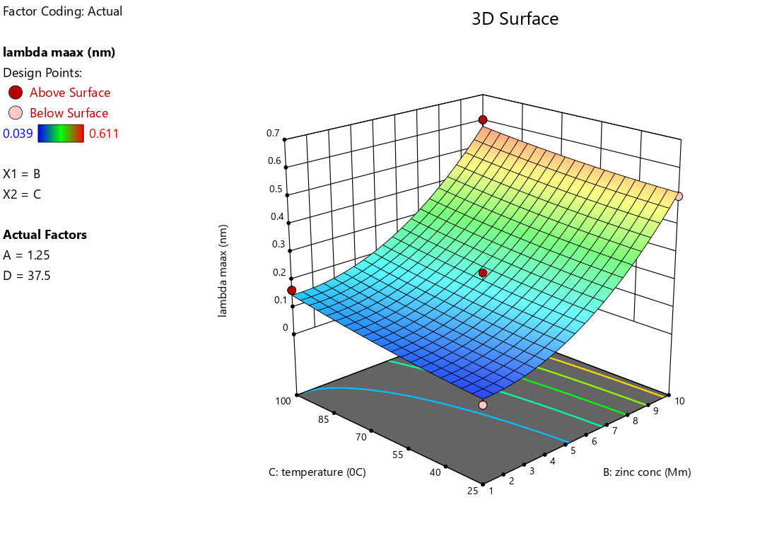 By using Box-Behnken Design (BBD) through Design Expert Software. Two factors key responses namely particle size and polydisperity index were used for optimization process along with three variables are used depending on temperature, concentration of ZnNPs and extract volume at low-high levels [28]. 3D response surface plots and 2D contour plots were examined to demonstrate the presence of interactions between independent variables and also shows their impact on response variables. From fig. 1-4 shows the particle size of nanoparticles of response surface analysis and the relation between concentrations of ZnNPs. whereas when the concentration of NPs increases, temperature slows down at low levels, which reveals the small declining of synthesized zinc nanoparticles. The research depicts that increase in concentration of Zinc nitrate hexahydrate had non-linear effect on zinc nanoparticle size along with sharp increase at high temperatures. Further, it also shows the linear impact on particle size at extreme level. The interaction between Zinc nitrate hexahyrdate and Cordyceps militaris showed a formation of curve linear relationship with large particles at high and low levels. The combined effect reveals the temperature and mild volume of extract with increasing impact on particle size. The 2D contour plots yielded similar findings. As shown in fig. 4, a rise in temperature was accompanied by a steep drop in zinc nanoparticle size when combined with varying volumes of Cordyceps militaris extract.