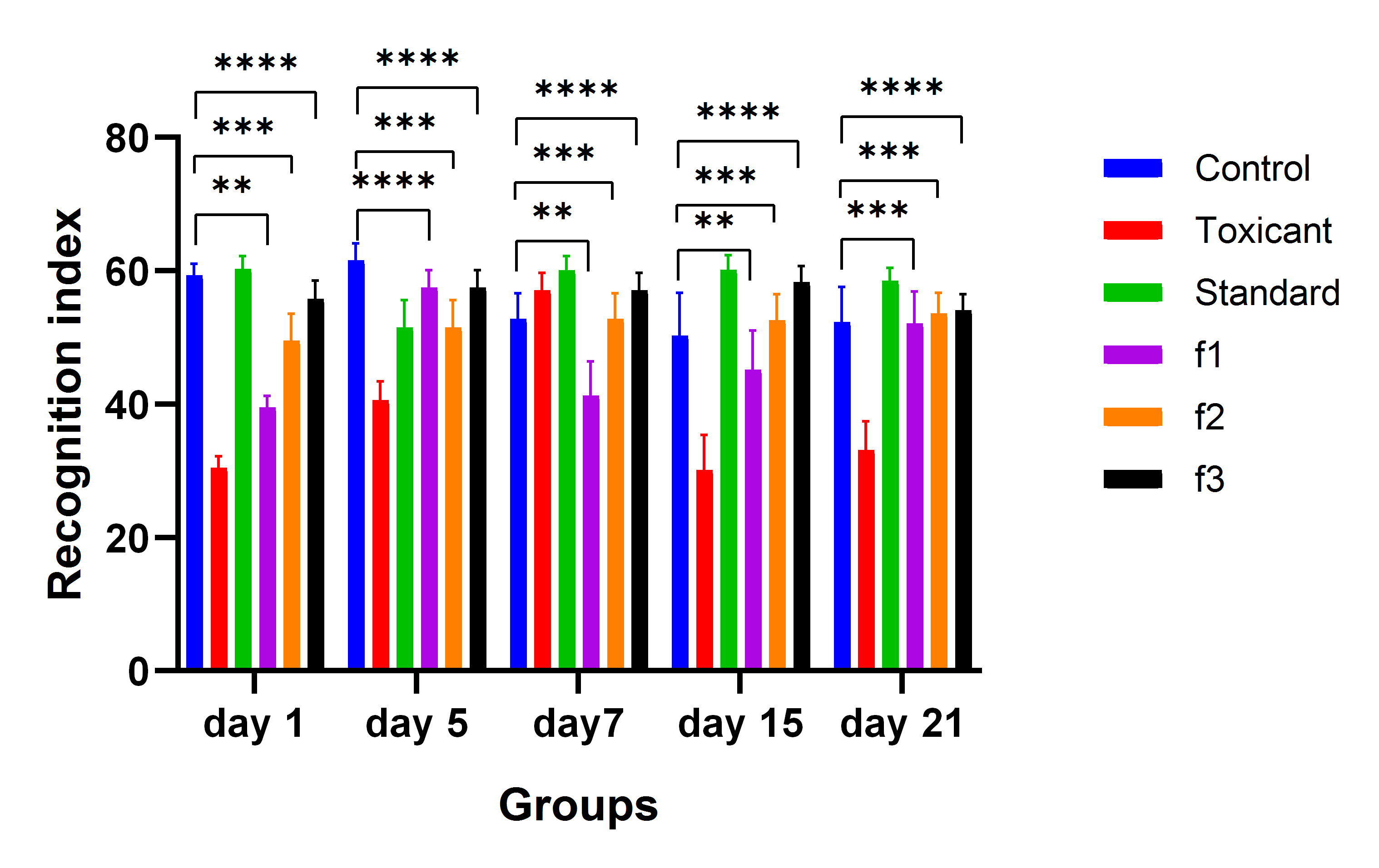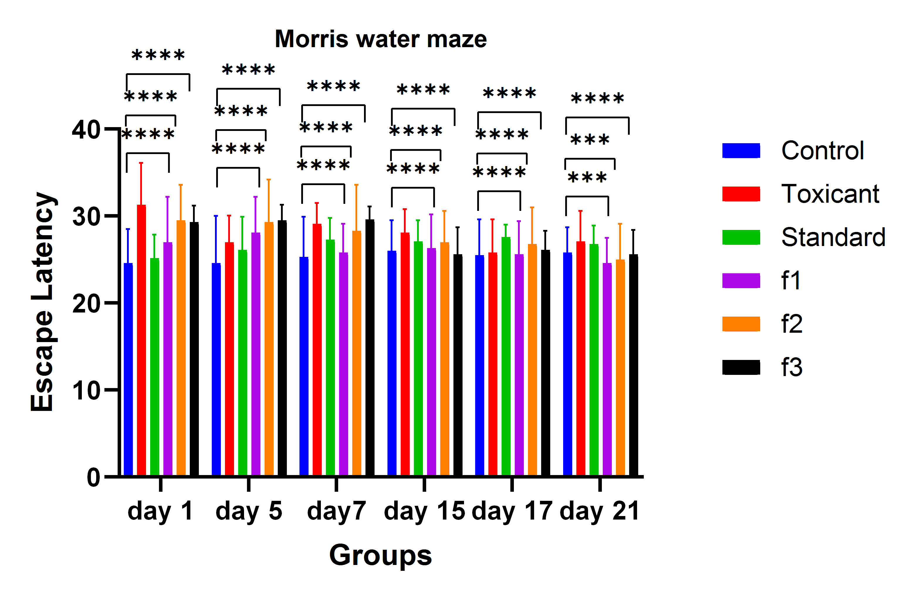 Data are expressed as mean ±SD seconds, N= 6 animal in each group with p<0.05 when compared with normal, toxicant as well as standard group respectively. Data were examined by using Two way ANOVA followed by Turkey's multiple comparisons test, one way ANOVA and one-way ANOVA with followed by t-test was applied respectively for Morris water maze, Y Maze test and anticholinesterase study through Graph Pad Prism version: 10 (fig. 9, 10 and 11). In this test, we examined a significant difference in escape latency, behaviour activity and anticholinesterase activity in between the control and treatment groups, in which control group takes long time to find the hidden platform. As, there was no distinct difference in swimming speed as compared to other two groups, which reveals that the treatment group have prolonged escape latency not because of impaired motor function. Furthermore, our results depicts that the f3 group exhibited reduced spatial memory performance, as it shows the decrease in number of crossings over the platform location with spending less time in target quadrant as compared with other groups. So, these findings indicate that the f3 group has impaired spatial learning and memory abilities [32].