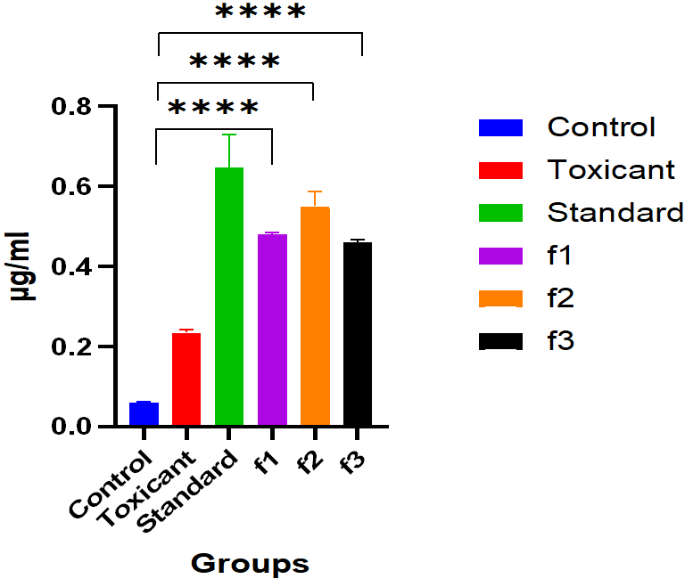 Fig. 11: Anticholinesterase study of experimental subjects; Ordinary one-way ANOVA and unpaired t-test shown more significant value p<0.001 of f1, f2 and f3 when compered with control