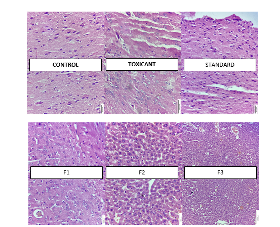 The hippocampus region of the brain showed improved neuronal health in mice treated with green synthesized nanoparticles (f1, f2, f3 groups) compared to the toxicant group. Although some neuronal loss was observed in the f1-f3 groups, they demonstrated better neuronal density and texture than the toxicant group. Notably, the f3 group had significantly lower levels of Tau and Aß proteins, indicating a reduced risk of neurodegenerative diseases like Alzheimer's. This suggests a more stable and healthy neural environment in the f3 group [35].