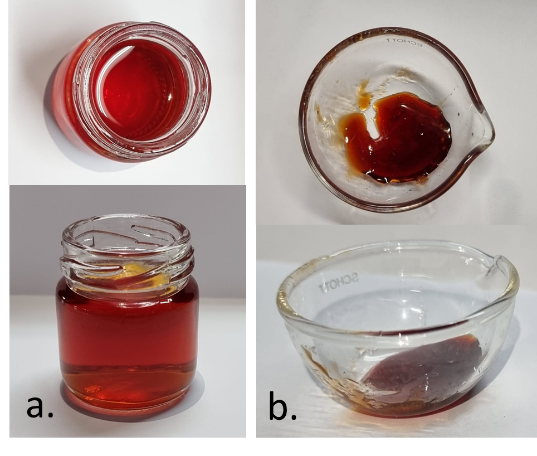 Fig. 1: Visual appearance of the FYCHEE: a. Semi-concentrated extract; b. Dry extract