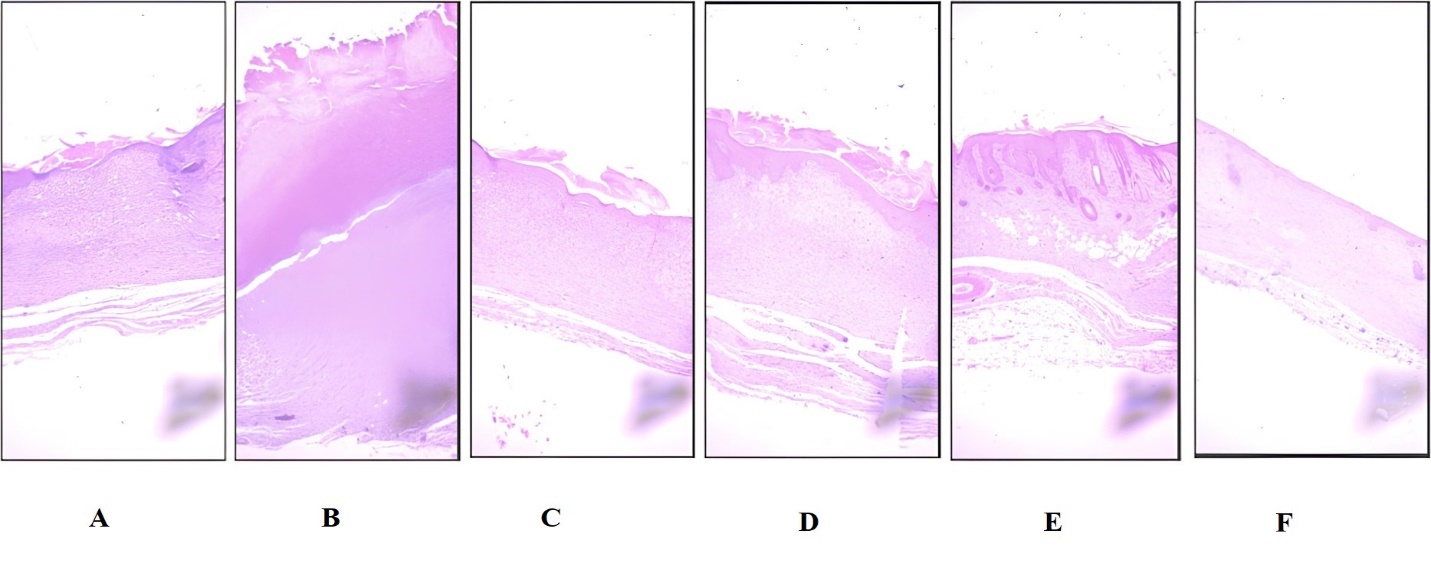 Fig. 5: Re-epithelization progress on day 9 of diabetic wound healing. A. Untreated Non-Diabetic Group (UTNDG); B. Untreated Diabetic Group (UTDG); C. Positive Control group (PC); D. Wound applied with FYCHEE 5% gel (E5%); E. Wound applied with FYCHEE 10% gels (E10%); F. wound applied with FYCHEE 20% gels (E20%)