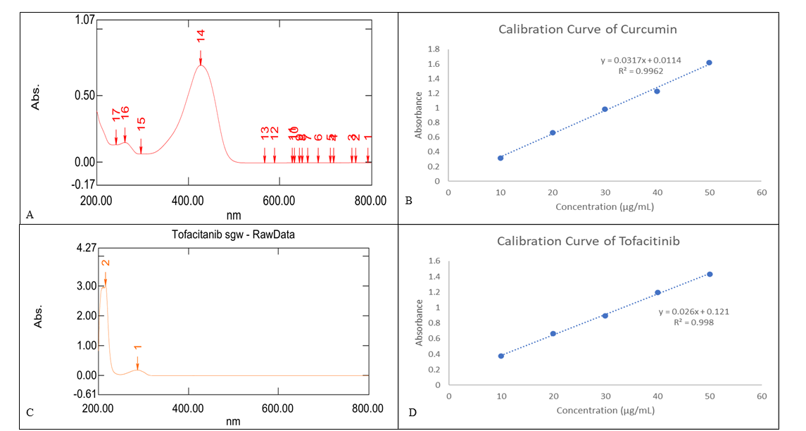 A standard stock solution (1000 µg/ml) of CS and TF was prepared by weighing 10 mg and adding in 10 ml methanol for curcumin and 10 ml water for tofacitinib, employing a 10 ml volumetric flask. The combination of Curcumin and Tofacitinib stock solution was prepared by weighing 5 mg each of curcumin and 10 ml methanol. This will be used for measurement of the maximum absorption of λmax of CS, TF, CS-TF, and CS-TF-NCs.