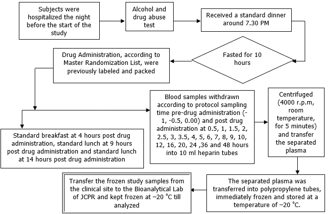 Only female subjects were enrolled in this study, who met the selection criteria designed to avoid interfering from the normal and variable available progesterone levels with the administrated progesterone. The selection criteria were including healthy postmenopausal women, within age between 45-65 y, menopausal for at least one year, with an endometrial thickness of less than 5 mm. Blood hematology and blood chemistry analyses were performed during the screening and follow-up examinations. Liver function tests and Creatine Phosphokinase (CPK) assessments were conducted at the screening stage, before each study period, and during follow-up evaluations. Physical assessments and clinical evaluations were carried out at both the screening and follow-up stages. Serology and urinalysis were conducted during the screening examination. Electrocardiograms (ECG) were performed at the screening and follow-up stages. A COVID-19 PCR test was conducted on day 0 of each study period. Each study period followed a randomized crossover design included a 7 d washout phase chosen according to the terminal elimination half-life of progesterone, to avoid the carry-over effect. After a 10 h fasting period, participants received a single intravaginal dose of either the test or reference drug in pessary form. Fig. 2 summarizes briefly the flow chart for the clinical design.