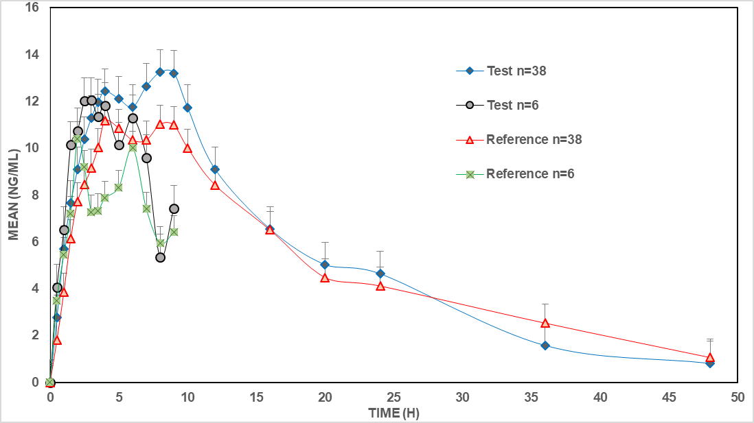 Fig. 3: The concentration-time profile for progesterone test product of 400 mg intravaginal pessary dose vs. the corresponding reference product of Cyclogest®under fasting conditions in both the pilot study (n = 6) and the full study (n = 38)