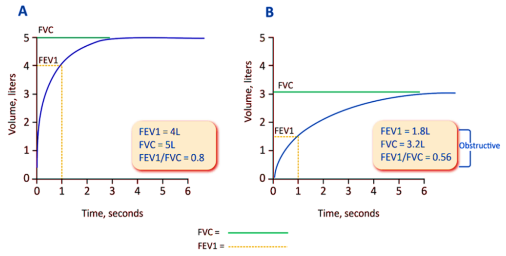 Fig. 7: A: Spirometry-normal tracing, B: Spirometry-Airflow obstruction; Due to airflow obstruction, patients with COPD usually have decreased FEV1 and, to a lesser extent, FVC (because of gas trapping) (BioRender.com)
