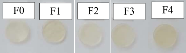 A drying shrinkage test was conducted to determine the amount of patch water loss after 24 h in the desiccator. Low moisture content suggests a stable patch protected from microbial contamination. A good patch should not be extremely dry to prevent breaking easily [9]. The test results showed that the formulas met the requirements of<10% [22]. F1 had the lowest drying shrinkage of 3.89%, while F0 and F4 had higher values exceeding 8.8%, signifying that gelatin polymer concentration increased with patch water content.