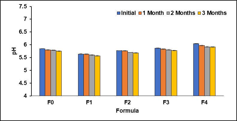 Fig. 2: PH of TTO patch for 3 mo storage (Data were expressed in mean±SD, n=3)