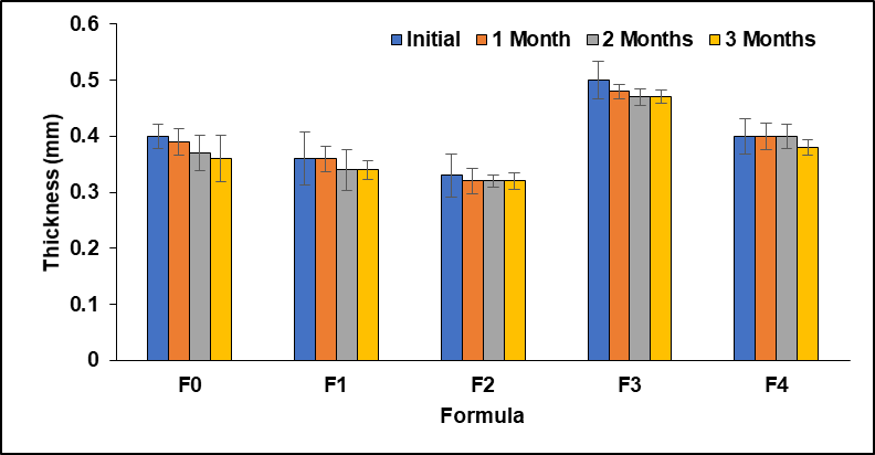 Fig. 4: Thickness of TTO patch for 3 mo storage (Data were expressed in mean±SD, n=3)