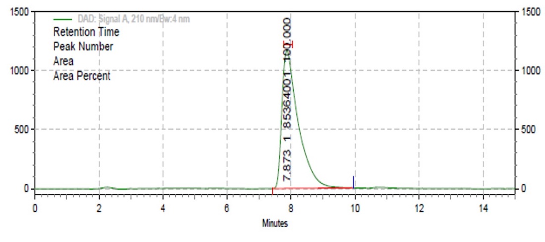 By using fingerprint profiles of extracted material, it was easy to identify the compounds present in plant species. HPLC fingerprinting of Ocimum tenuifloram extract showed major peaks at different retention times (min.) at wavelength 254 nm [62]. On the basis of HPLC analysis, the range of Eugenol into Ocimum tenuifloram plant extract was found to be 32.81% by mass with retention time 7.873 as shown in fig. 1.