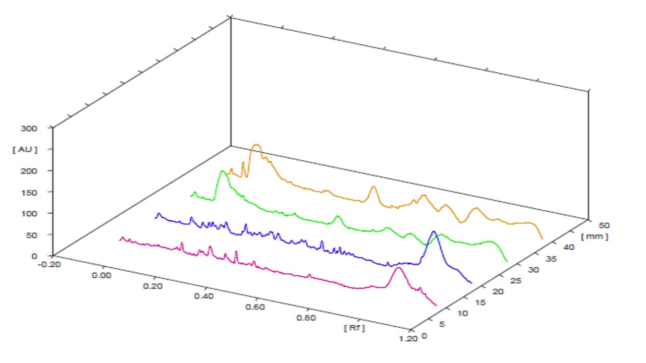 The extension of Thin Layer Chromatography (TLC) is known as HPTLC. It offers simplicity, efficiency, robustness and speed in analysis of plant extract into a quantitative manner. It enhances the resolution of constituents present in plant extract for its quantitative studies. The HPTLC chromatogram shows qualitative studies of standard Eugenol with plant extract as in fig. 2 [63, 64].