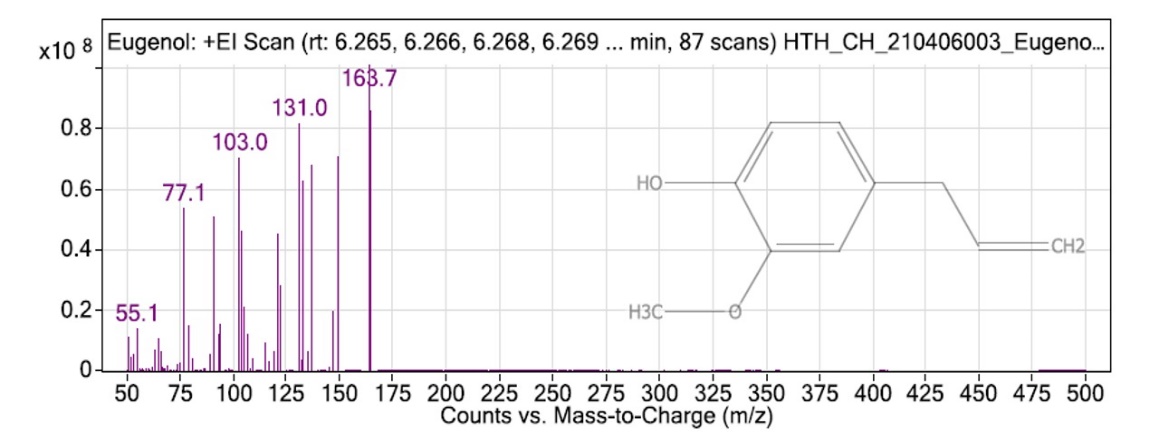 On the basis of retention time, the mass spectra on VF-5 capillary column compared with standard and identified the compounds. On the basis of qualitative analysis, by GC-MS analysis, some other chemical compounds also found rather than eugenol into Ocimum tenuifloram extract, like 4-Acetoxy-3-methoxystyrene, 1,5-Cyclodecadiene, 1,5-Dimethyl-8-(1-methyl ethenyl), Vanillin, Bicyclononane, 2-Methyl-4,8,8-trimethyl-4-vinyl, Alpha-guaniene. There were various chemicals present into extract of Ocimum tenuifloram and eugenol was also found with retention time of 6.381 in extract as shown in fig. 3 [65].