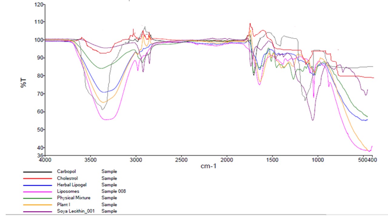 The FT-IR analysis of herbal extract, soya lecithin, cholesterol and polymers were carried out by analyzing on a spectrum 400, spectrometer (Spectrum Two, Perkin Elmer, US). The spectra of IR were measured in the range of 4000-400 cm-1. FT-IR analysis was used for the structure analysis of extracts. The potassium bromide (KBr) disc analysis was used due to its no absorption property of KBr into fundamental region of the IR spectrum. During analysis of FT-IR, the sample of a drug/extract was kept under a modulated IR beam into a die and the sample was analyzed [27, 28]. Then, analyzed the resulting pattern of FT-IR spectra and matched it with known spectra of identified compounds.