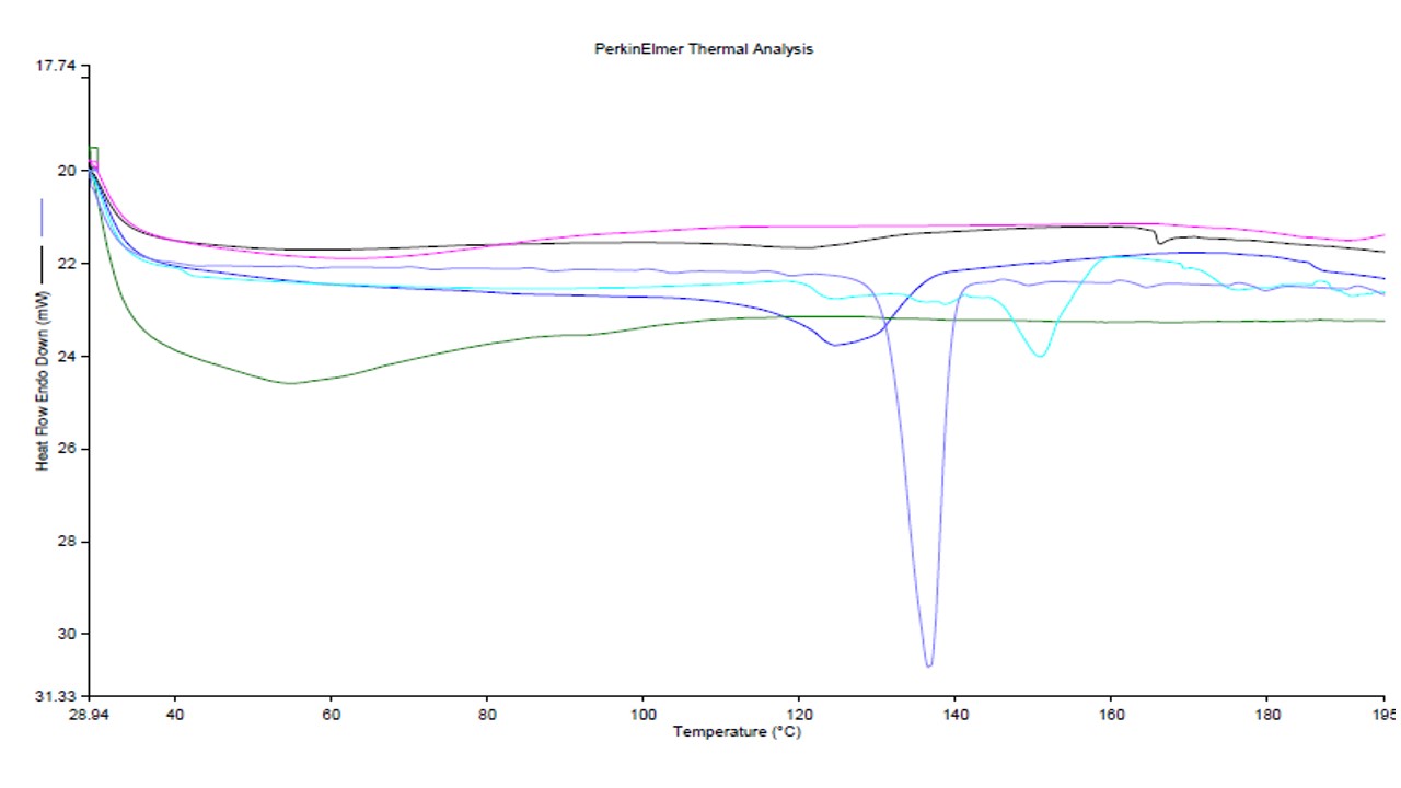 DSC equipment was composed of flow controller operating software, a calorimeter and a thermal analyzer. Samples of plant extract, polymers and other samples of herbal lipogel preparation were placed on the pan one by one and put inside the DSC instrument (DSC2-00347, TA instrument) and it started heating from 25-350 °C with rate of 50 °C/min into nitrogen environment [29, 30].