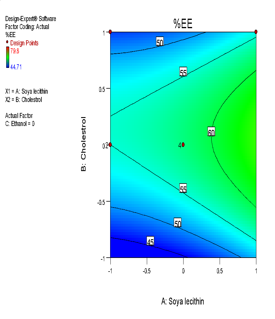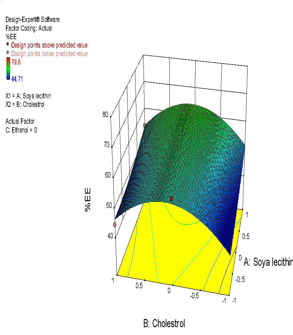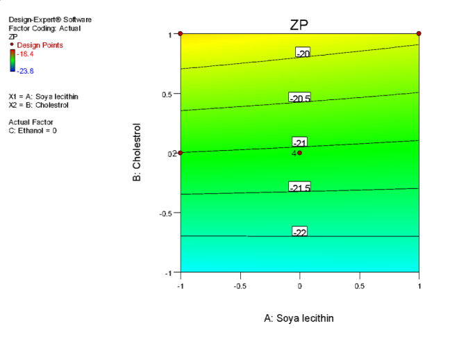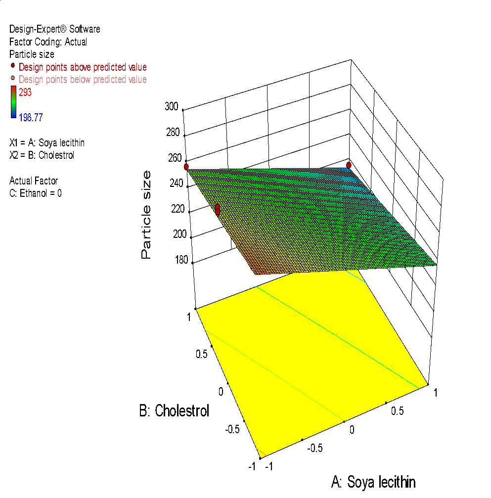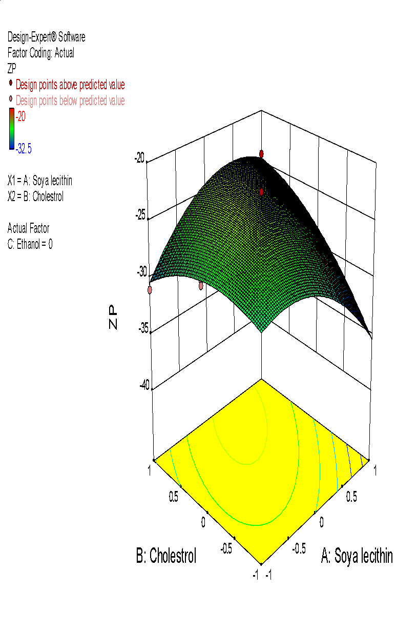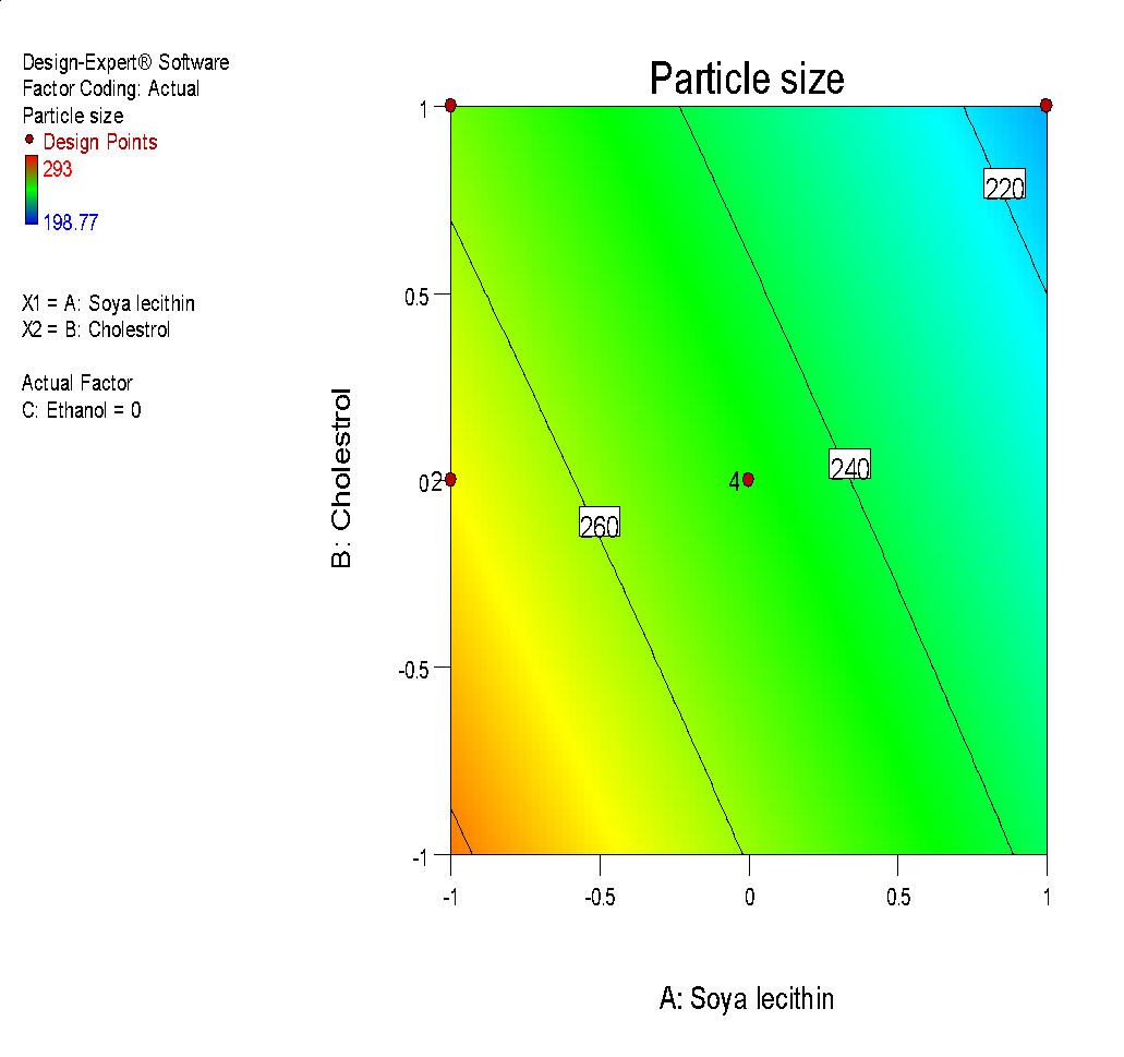 All these factors were selected in different ratios, with the total concentration that equals to 100 %. All these factors were fixed with regard on the basis of optimized formulation that was specially design for topical use. The dependent responses particle size (Y1), entrapment efficiency (Y2) and zeta potential (Y3) plays important role into absorption and diffusion of drug compounds into the site of application. The liposome particle with lesser size of particle, highest entrapment efficiency and maximum zeta potential was suitable as optimized batch for topical lipogel formulations.