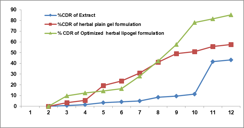 Different mathematical models are used as a base to compare release profile and predict release mechanism. For drug release kinetics of optimized herbal lipogel, log cumulative percent drug remaining vs. time (first order), cumulative percent drug release vs time (zero order), log of % cumulative release vs. log time (Korsmeyer and Peppas Exponential Equation) and cumulative per cent drug release vs square root of time (Higuchi plot) were plotted. Then calculate the value of R2from the graph. Considering the determination coefficients, Higuchi model was found to fit in release data best. The best fit model for drug release kinetics was confirmed by the value of correlation coefficient near to 1 [48, 49].