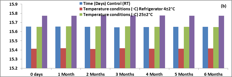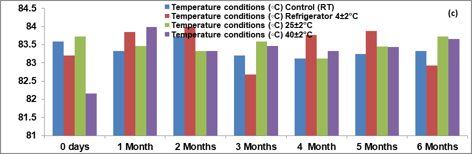 Stability study is the process of investigating drug loss from the liposomes and affects its stability during the storage period. An optimized batch of herbal liposomes was stored as per accelerated stability studies according to International Council for Hormonisation (ICH) in a stability chamber (NLHC 1631, Newtronic, Mumbai). The optimized batch of herbal lipogel was kept into a vial and stored in a refrigerator (4±2 °C), control conditions (25±2 °C/60±5% RH), and 40±2 °C/75±5% RH for 6 mo away from direct light. After a few days of interval, 1–6 mo, herbal extract present into liposomes was centrifuged and evaluated by its pH, entrapment efficiency, cumulative drug release, spreadability and viscosity [59].