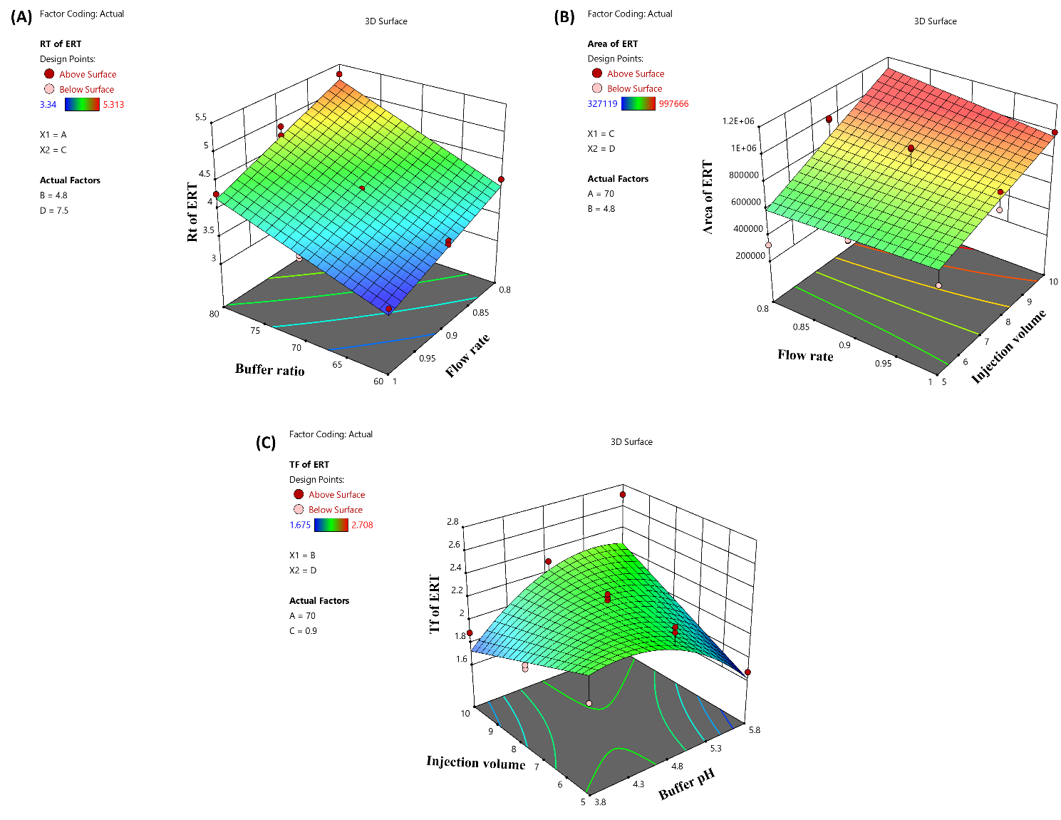 The critical factors leading to ERT's efficient elution must be identified and examined to design the optimal chromatographic method for analyte estimation. Numerous expensive, time-consuming tests might be carried out without an experimental design. As part of an improved procedure, the identified essential variables must be refined to get accurate experimental values. A thorough understanding of the chemistry of each component and how they relate to one another is necessary to optimize values for these crucial HPLC parameters. DoE is a mathematical technique that might assist you in understanding these different degrees of complexity. To assist in locating the sweet spot in parameter space where a dependable response could be produced, DoE employs a variation of response surface types. Central Composite Design (CCD) and Box Behnken Design (BBD) are two possible approaches [20, 21]. A quadratic design assessed the impact of both independent and interaction factors. This approach generates a more accurate image since it does not take into account the variable's outlier values. For this reason, the BBD model method was adjusted using the DoE program. The BBD has the advantage of requiring fewer runs than the CCD. The BBD is frequently chosen over the CCD because of its efficiency and practicality. BBD usually necessitates fewer experimental runs, saving money while yielding reliable data for optimization. All experimental circumstances are safe and feasible since BBD stays away from extreme combinations of factor levels present in CCD. Better quadratic impact estimation is made possible by this design emphasis on mid-level parameters, which eliminates the potential complexities that come with extreme values. Furthermore, BBD is especially helpful for well-informed procedures where the center of the design space is anticipated to be the optimal. Regarding experimental design, BBD is useful since it provides a simplified method that strikes a compromise between thoroughness and resource efficiency. In this optimization method, the injection volume (X4), pH (X2), flow rate (X3), and phase ratio (X1) of the buffer (chromatographic parameters) were utilized as independent variables. Simultaneous measurements were made of the RT of ERT (Y1), peak area of ERT (Y2), and TF of ERT (X3).