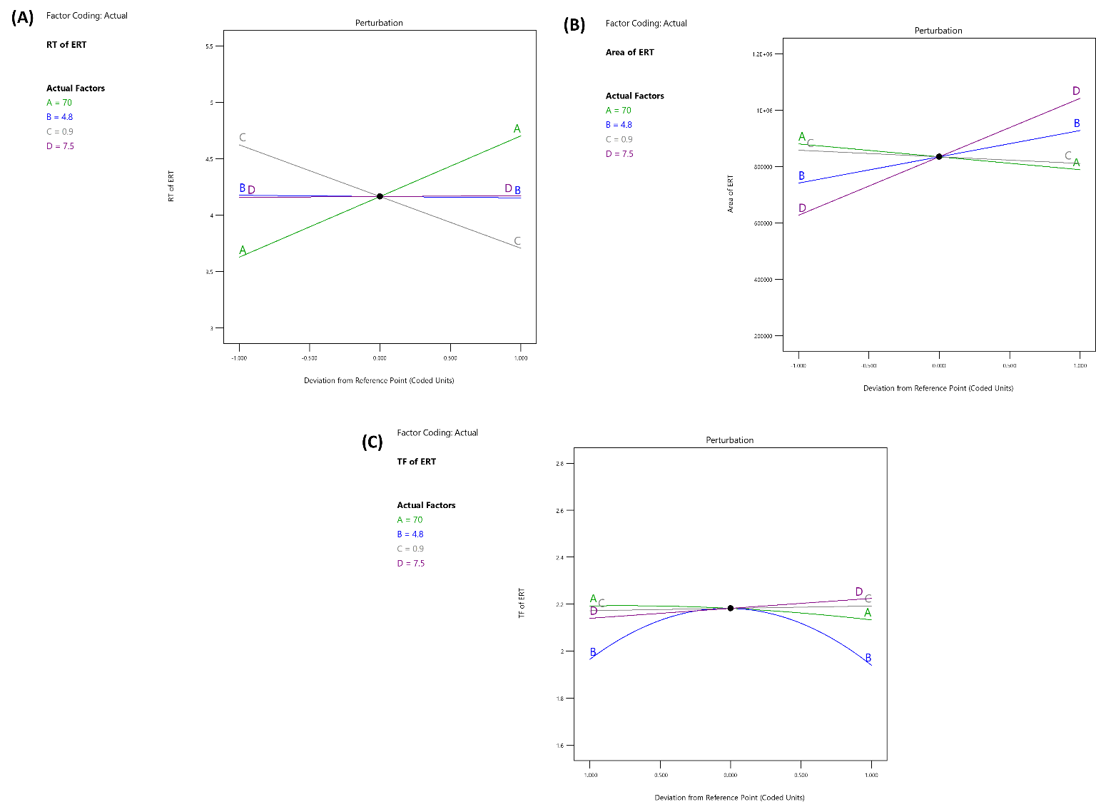 Fig. 3: A perturbation diagram that illustrates how independent variables interact (3A) on the retention time of ERT, (3B) on the peak area of ERT, (3C) on the tailing factor of ERT