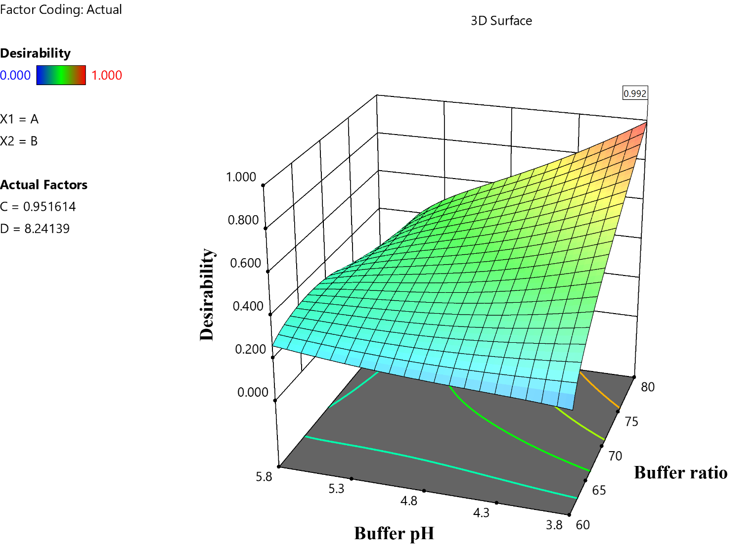 In the current work, we optimized the following independent variables using a three-level BBD: Buffer ratio (X1), buffer pH (X2), flow rate (X3), and Injection volume (X4). The findings of pilot OFAT experiments were used to establish the upper and lower bound values for these crucial parameters. For the buffer ratio in the mobile phase, we set a lower limit of 60% and an upper limit of 80%. The pH of the buffer varied between 3.8 (the lower limit) and 5.8 (the upper limit), while the flow rate was between 0.8 ml/min (the lower limit) and 1 ml/min (the upper limit). 5 µl (lowest limit) to 10 µl (highest limit) of injection volume were covered. On the other hand, using only OFAT-based methods might be difficult and time-consuming. As a result, using BBD and other response surface designs speeds up the optimization process and improves the creation of a reliable analytical method.