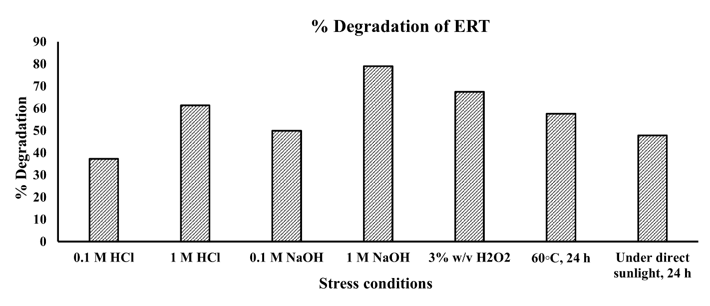 In order to evaluate ERT's stability across a range of stress conditions, including those experienced during formulation development, a forced degradation study was carried out. As seen in fig. 6 and 7, ERT showed signs of sensitivity to specific stressors. In particular, it showed notable degradation in stress conditions. Degradation was more than 37% in a 0.1M HCl solution and over 61% in a 1M HCl solution. In environments that are acidic ERT may hydrolyze, particularly when it has functional groups that are highly susceptible to acid-catalyzed reactions. The amide or ester group, for instance, may be impacted. Degradation was significant at alkaline circumstances; in a 0.1M NaOH solution, it was over 49%, and in a 1M NaOH solution, it was over 79%. ERT can experience nucleophilic substitution, depending on its functional groups. Aldehydes and ketones are examples of groups that may react with nucleophiles that inhibit an alkaline environment. In addition, more than 67% deterioration was seen upon exposure to an H2O2 solution. ERT showed less degradation than acidic, alkaline, and H2O2 in other stress conditions. Degradation products may come through reactive oxygen species, damaging ERT unsaturated bonds or other areas of vulnerability as a result of oxidative stress. ERT showed more than 57% degradation in exposure to sunlight (UV) and at elevated temperature 47%. ERT stability and any issues encountered during formulation or storage can be clarified by appreciating the degradation mechanism. That knowledge can direct the development of stabilizing methods to stabilize ERT, such as the use of antioxidants or improvements to storage conditions.