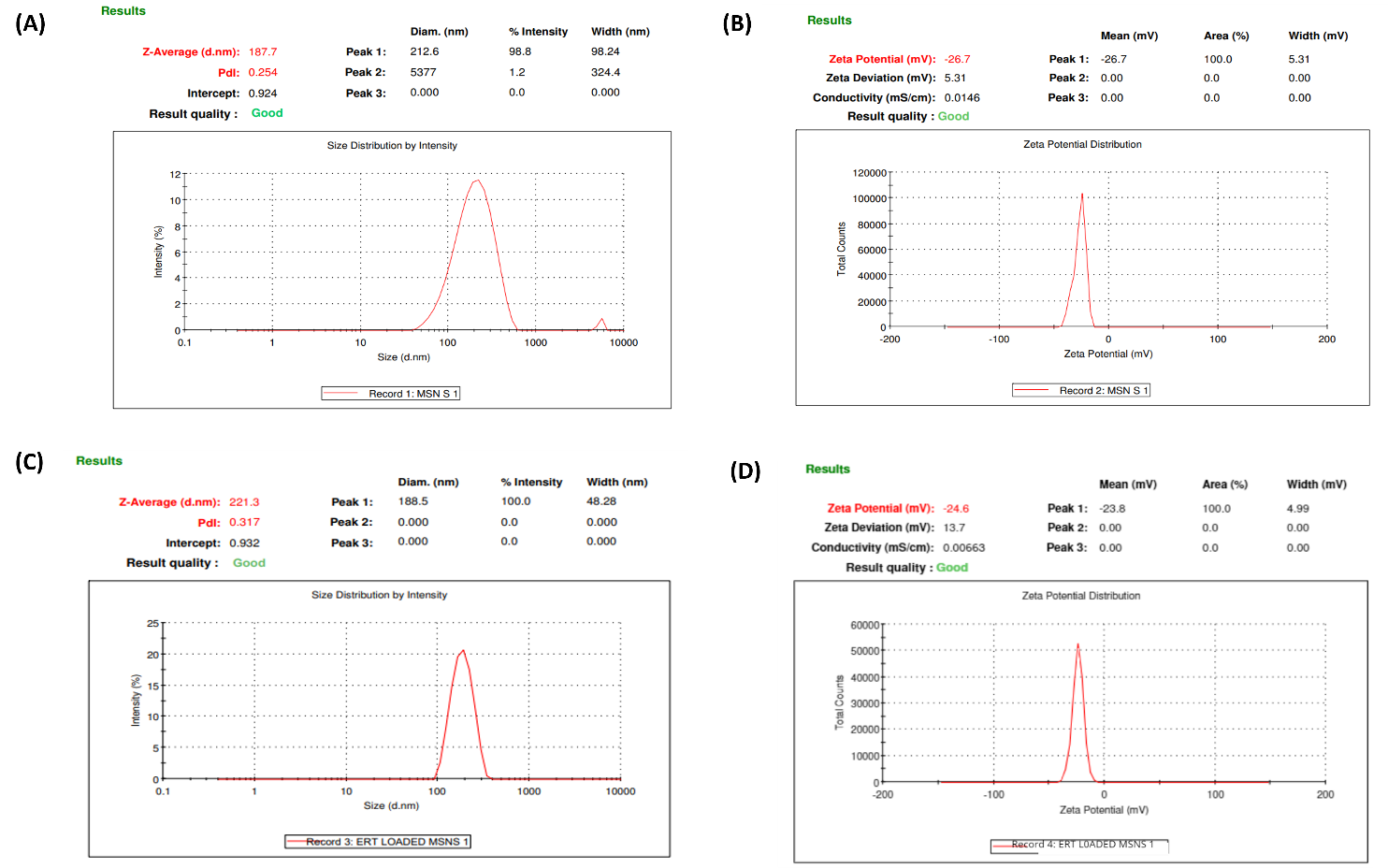 Fig. 8: Characterization of fabricated formulation: (A) Particle size of placebo MSNs, (B) Zeta potential of placebo MSNs, (C) Particle size of ERT@MSNs, (D) Zeta potential of ERT@MSNs