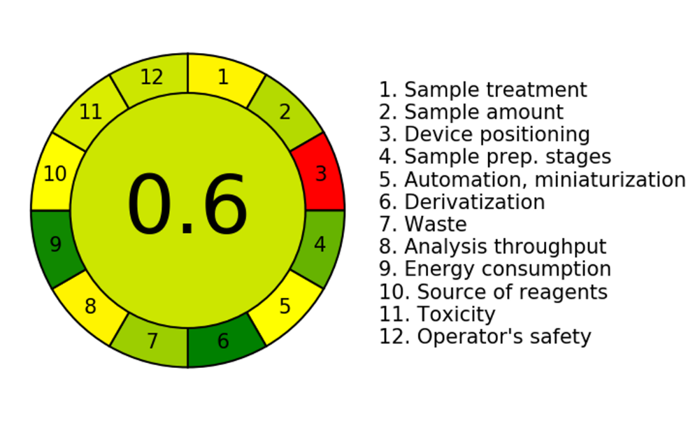 Pena Pereira F, Wojnowski W, Tobiszewski M. AGREE-analytical GREEnness metric approach and software. Anal Chem. 2020;92(14):10076-82. doi: 10.1021/acs.analchem.0c01887, PMID 32538619.