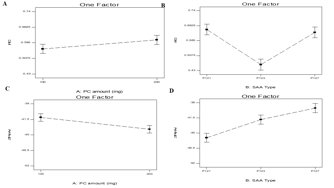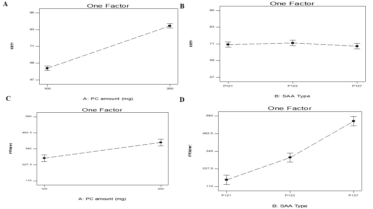 ZP was measured and presented in table 2,3 and illustrated in (fig. 5C-D). It is noticeable that both phospholipid amounts (X1) and SAA type (X2) significantly influenced the PS of the vesicles with p values of 0.0088 and 0.006, respectively.