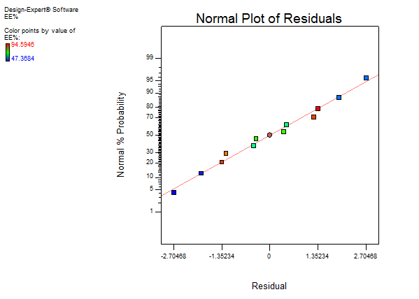 For PC amount (X1), it was found that increasing the amount of PC increased ZP. It was expected that in a low ionic strength media, the polar head group is oriented in a manner that the negatively charged phosphatidyl is directed to the out while the positively charged choline group is located to the inside, producing a negative charge. Hence by increasing the phospholipid amount, the negative phosphatidyl group would increase [26].