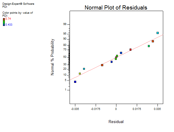 PDI =+0.58+0.022* A+0.065* B [1]-0.12* B[2]-0.062* AB[1]-0.015* AB[2]