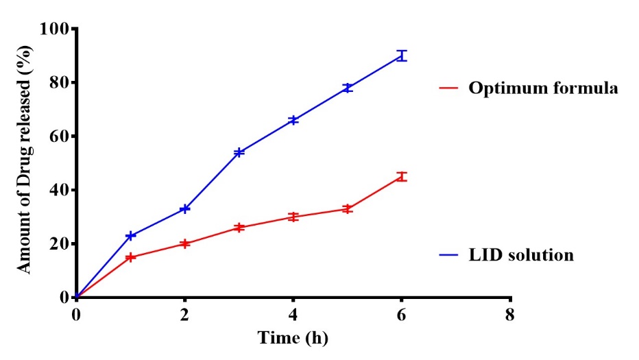 Regarding the saturated solubility of LID, the utilization of phosphate buffer pH (5.5) (maintained sink condition and the saturated solubility was 5.33 greater folds than the aqueous solubility of LID. Subsequently pH 5.5 was selected as proper medium for in vitro release.