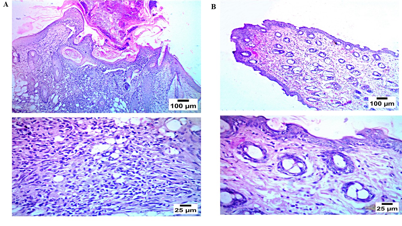 The study design was authorized by the ethical committee of the Al-Ayen University College (AUIQ-REC-A24001). Six animals supplied by Al-Ayen university animal house were divided into two groups where groups one behaved as control left untreated, while group two was treated with the optimum LID transferosomes. The rats were provided with water and a standard diet, at 22 °C, 55% humidity, and a cycle of 12 h dark followed by 12 h light. Rats remained to adapt for 7 d. The treatment lasted one day. After being fixed for 24 h in 10% formol saline, skin samples were cleaned, and alcohol was used to dehydrate them. Following a 24 h period at 56 °C, the specimens were cleaned, imgded blocks, and sectioned using a microtome (Leica, USA) at a thickness of 4 mm for each skin sample. Using light microscopy, the specimens were deparaffinized and stained with hematoxylin and eosin, for histological analysis. (Axiostar plus, Zeiss, New York) [18].