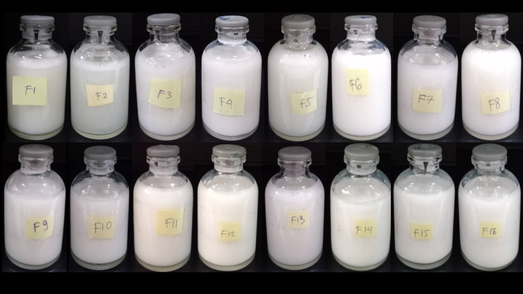 Fig. 1: Physical appearance of favipiravir nanostructured lipid carrier formulations labelled F1 to F16