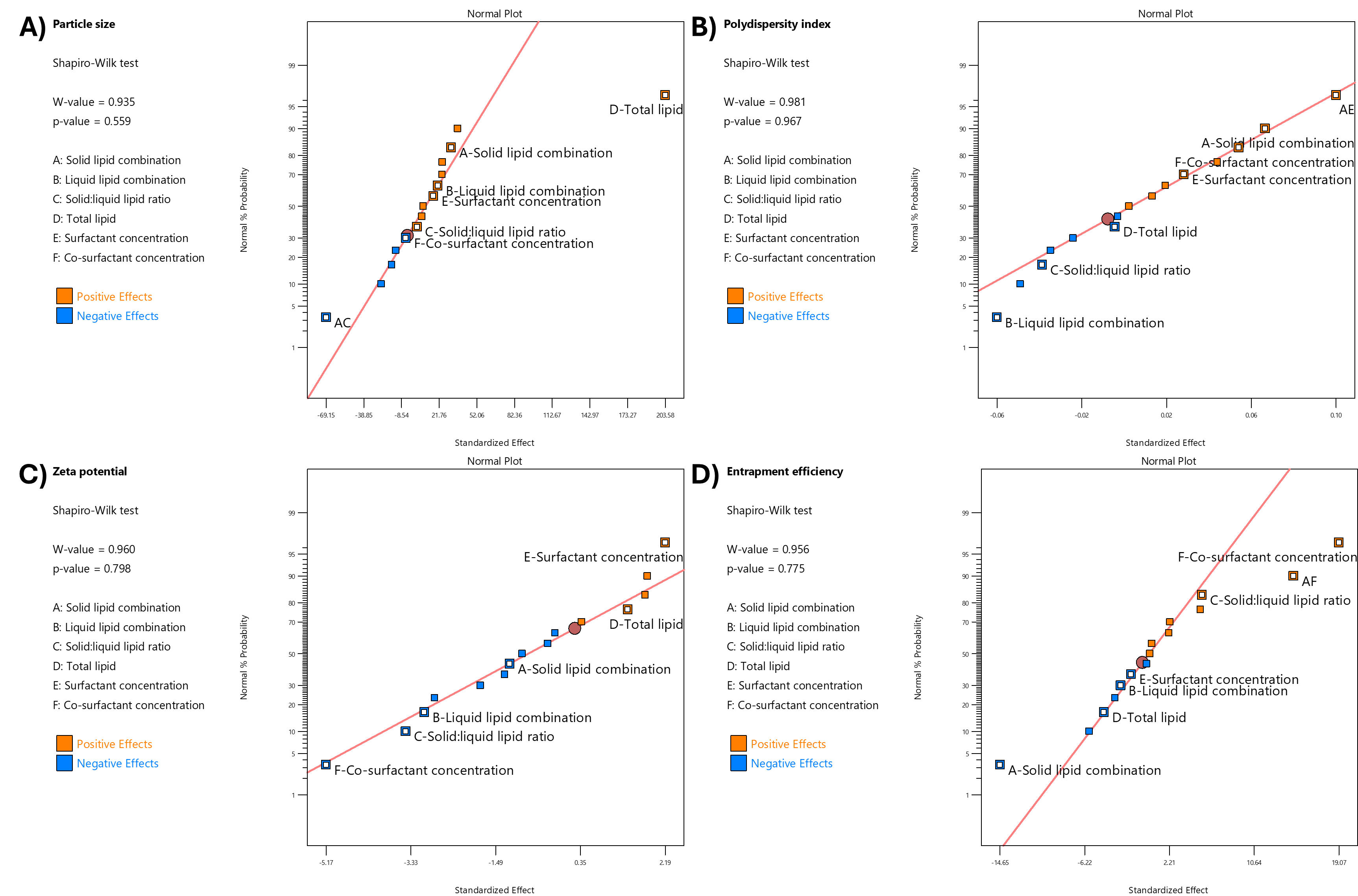 Fig. 2: Relationships between independent variables and nanoparticle characterization parameters: (A) particle size, (B) polydispersity index, (C) zeta potential, and (D) entrapment efficiency. Data points represent positive effects (orange) and negative effects (blue). The residuals were evaluated using the Shapiro-Wilk test, indicating a normal distribution with p-values>0.05