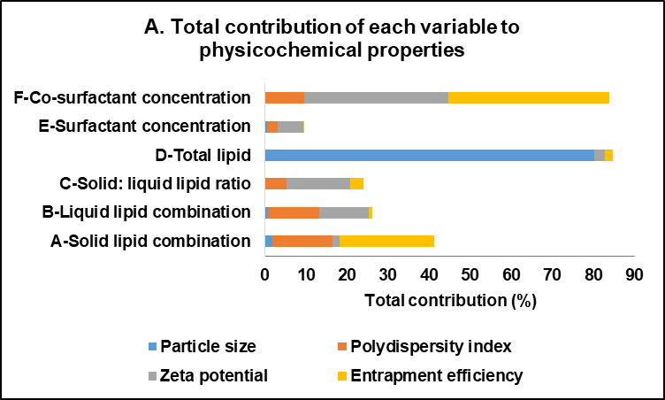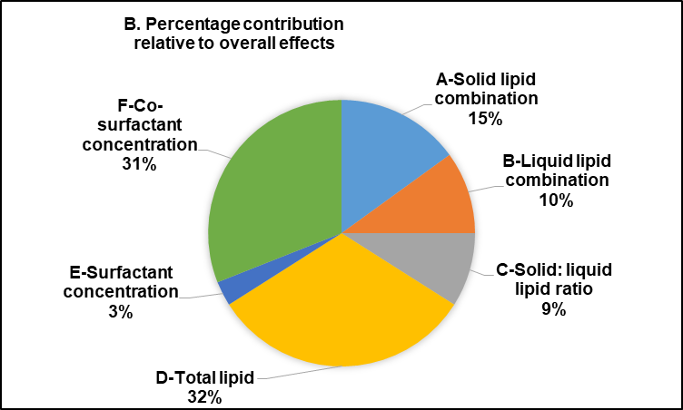 Fig. 3: Total contribution of each variable to physicochemical characteristics of favipiravir-loaded nanostructured lipid carriers: (A) The total contribution column represents the cumulative impact of each variable across all nanoparticle parameters, and (B) The percentage contribution demonstrates the proportional significance of each variable in relation to the overall effects