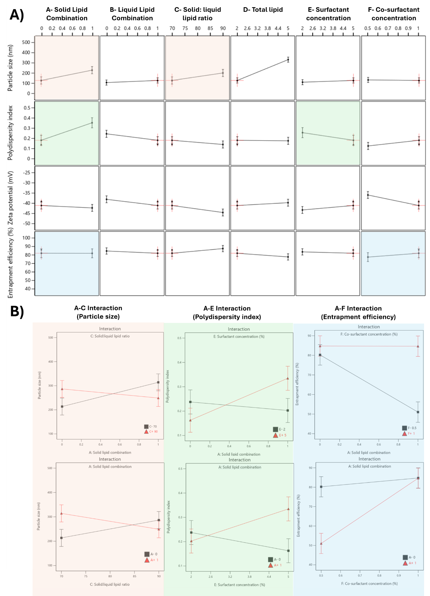 Fig. 4: Effect of formulation variables on physicochemical characteristics of favipiravir-loaded nanostructured lipid carriers. (A) The influence of various formulation variables on physicochemical properties: particle size (nm), polydispersity index, zeta potential (mV), and entrapment efficiency (%). (B) Interaction plots for significant formulation variables on particle size (left), polydispersity index (middle), and entrapment efficiency (right)