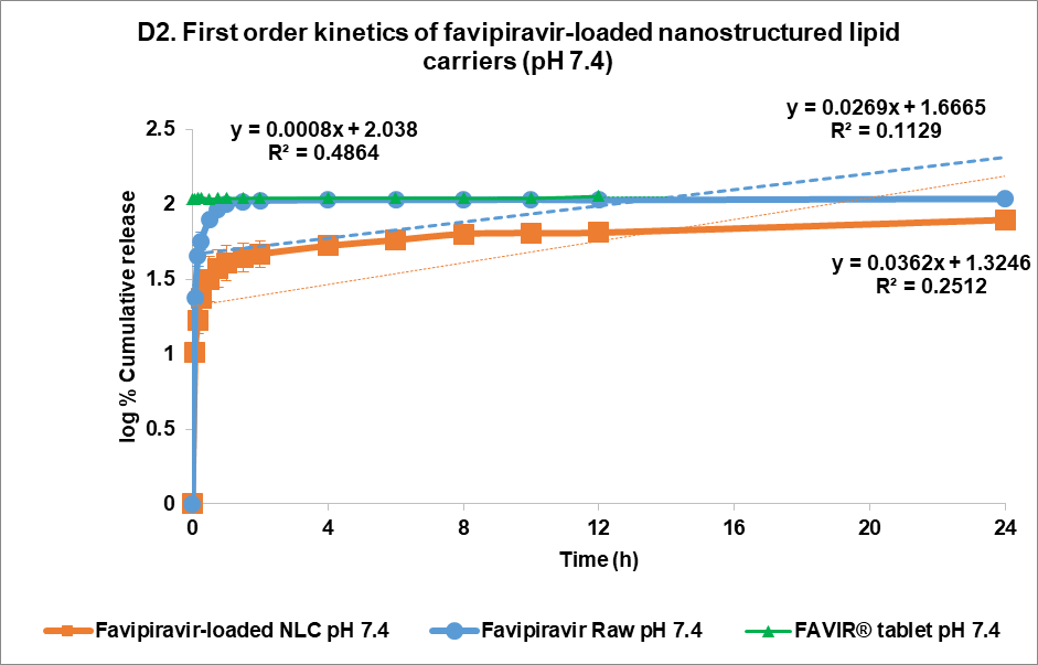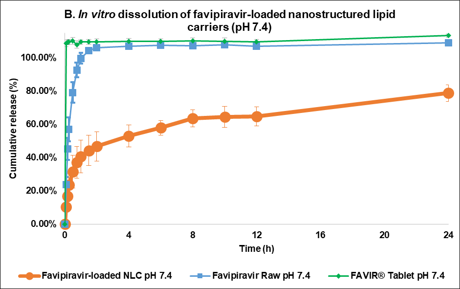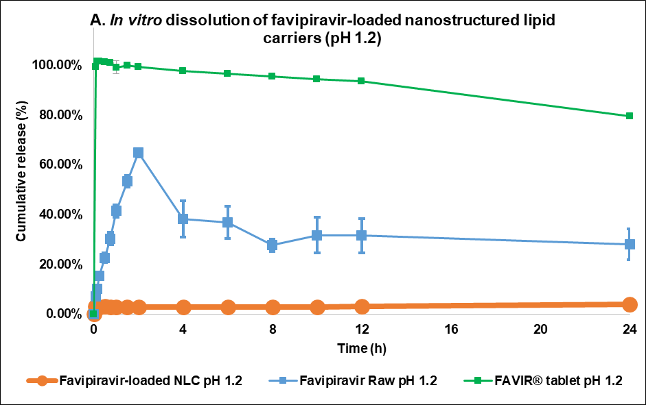 Objective: Favipiravir (FVP), an RNA-dependent RNA polymerase inhibitor with low solubility and bioavailability, was encapsulated and optimized into Nanostructured Lipid Carriers (NLC) to improve solubility and control its release profile.