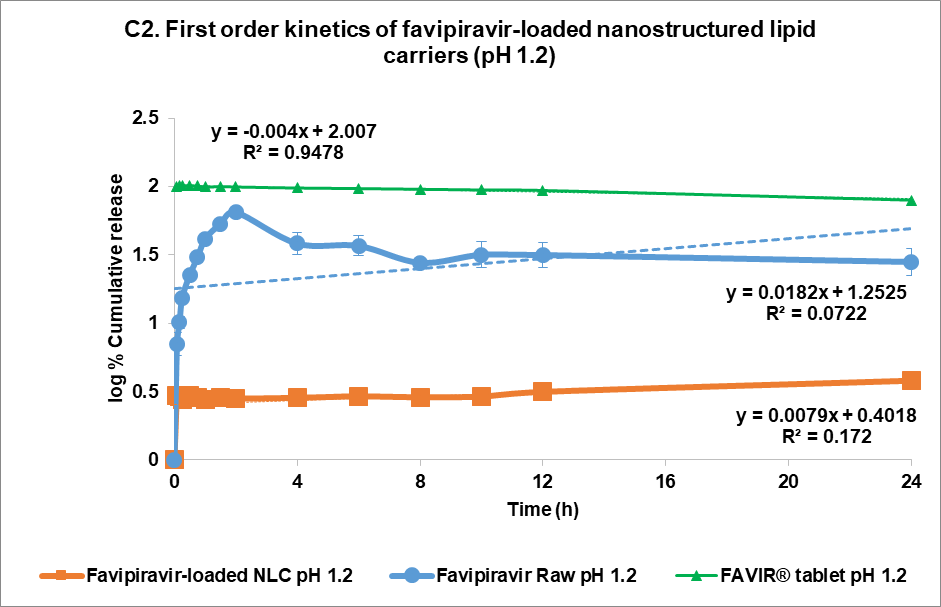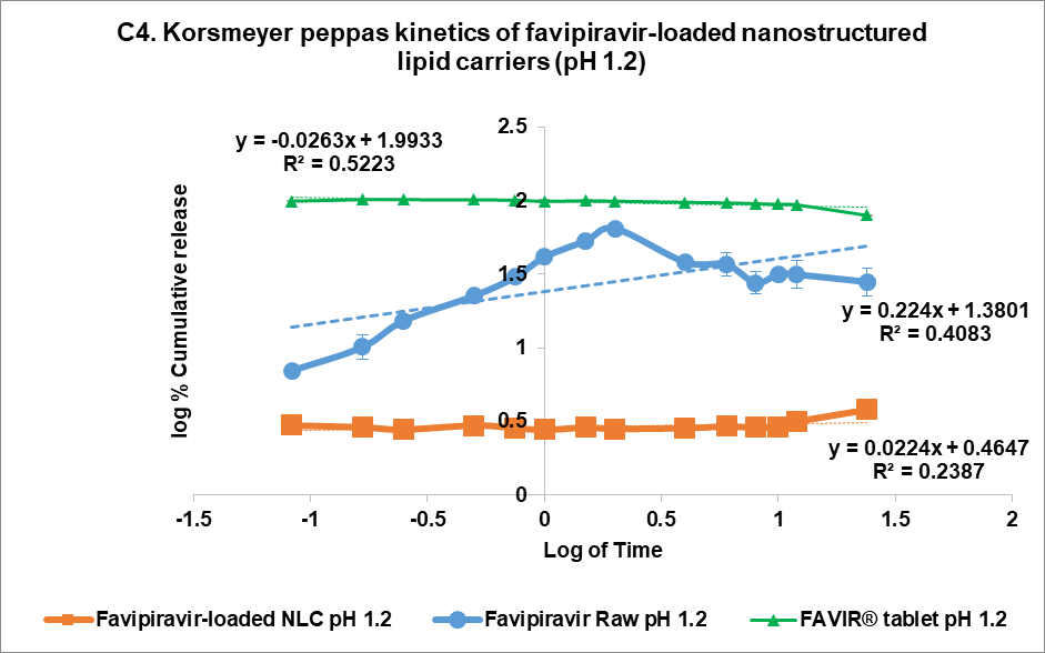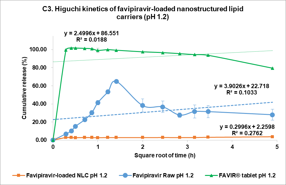 The drug release kinetics at pH 1.2 and pH 7.4 were evaluated using multiple models (fig. 4C and 4D, respectively): zero-order (1), first-order (2), Higuchi (3), and Korsmeyer-Peppas (4) models [44]. In the acidic medium (pH 7.4), both FVP itself and the F3 formulation showed a poor correlation in all models. The highest correlation for the former was the Korsmeyer-Peppas model (R² = 0.4083) with an n value of 0.224, while F3 correlated to the Higuchi model with R² = 0.2762. This strongly indicated that the release of FVP and F3 formulation was influenced by Fick diffusion, though the very low release from F3 means that the analysis of these data is compromised by the low signal. In comparison, the release from the FAVIR® tablet exhibited a strong correlation with the first-order model (R² = 0.9478) with a negative slope, which indicated that the concentration of FVP decreased over time due to the instability of FVP in the acidic medium.