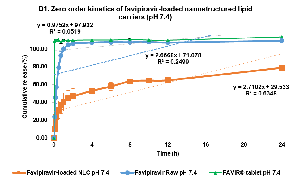 The in vitro release evaluation of FVP raw material and FVP-NLC was carried out using a dialysis bag with a molecular weight cutoff of 12,000–14,000 Da. Prior to the experiment, the dialysis bag was pre-soaked overnight in the release medium. The release study utilized 0.1 M HCl and 0.1 M KCl, pH 1.2 solution to simulate gastric conditions and phosphate-buffered saline (PBS, containing 137 mmol sodium chloride, 2.7 mmol potassium chloride, 8 mmol sodium phosphate dibasic, and 2 mmol potassium phosphate monobasic) at pH 7.4 to simulate intestinal conditions. A dialysis bag containing FVP-NLC, equivalent to 10 mg of FVP, was immersed in 200 ml of dissolution medium maintained at 37±0.5 °C with continuous stirring at 100 rpm. At times specified, 1.0 ml was withdrawn from the dissolution medium for analysis, and the same volume of fresh dissolution medium was added to ensure sink conditions throughout the study [24, 25]. The withdrawn samples were filtered using a 0.45-µm syringe filter and analyzed using RP-HPLC at λ = 323 nm. In comparison with commercial tablets, FAVIR (GPO)® containing 200 mg of FVP was also evaluated in both solutions (pH 1.2 and pH 7.4) using a USP dissolution apparatus type II (paddle) at 100 rpm for 24 h with a volume of 900 ml. To interpret the release data in both solutions, the profiles were tested against various kinetic models, including zero-order, first-order, Higuchi, and Korsmeyer–Peppas. The model with the highest correlation coefficient was selected as the most appropriate fit for the release behavior of the drug [26-28].