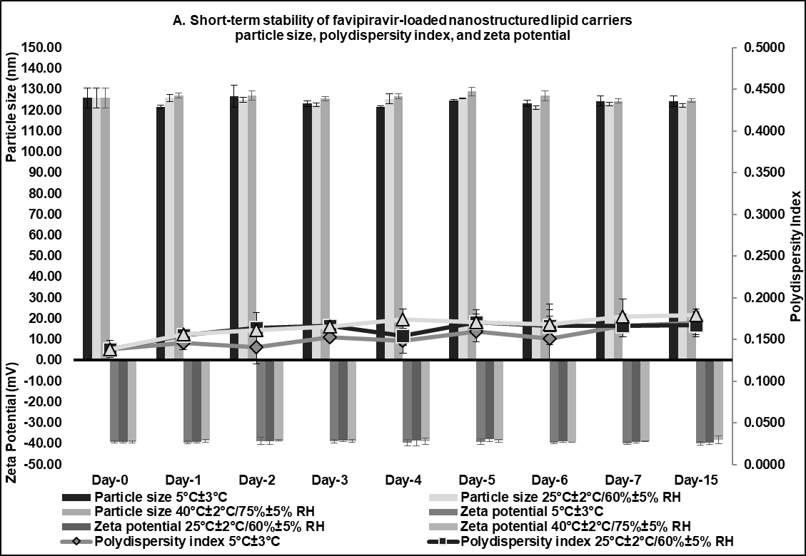 Fig. 6: Short-term stability studies of optimum favipiravir-loaded nanostructured lipid carriers formulation (F3) for 15 d: (A) particle size, polydispersity index, zeta potential, and (B) entrapment efficiency