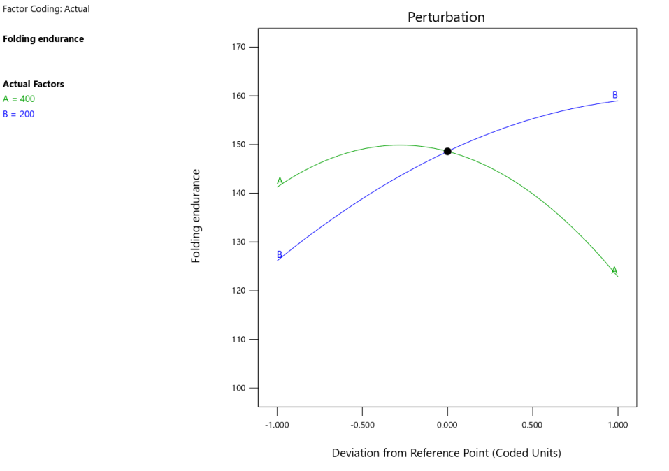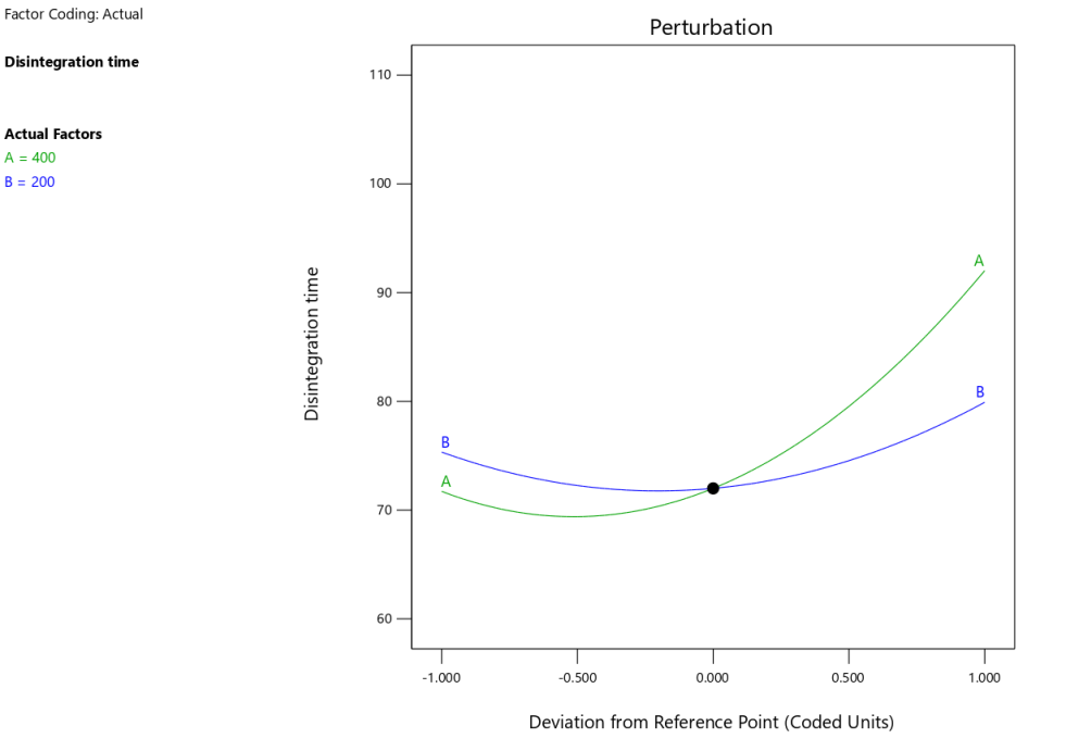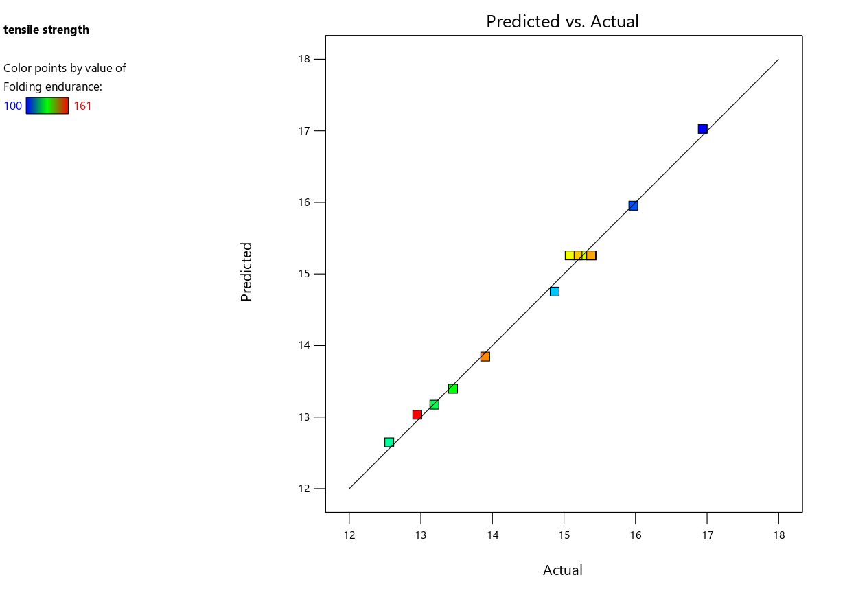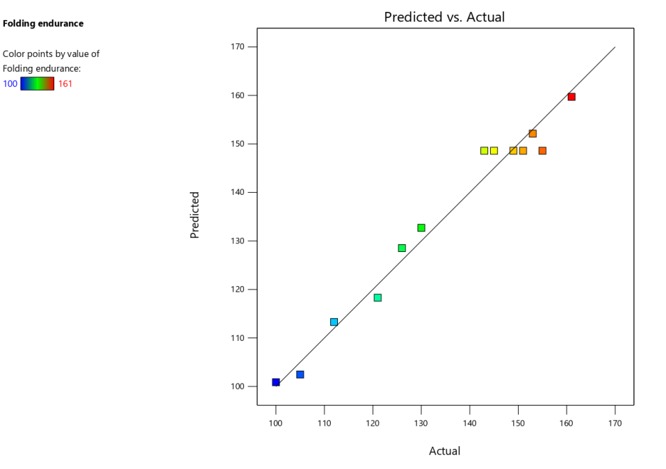 The predicted vs. actual plot (fig. 3a) confirmed the model’s reliability in predicting folding endurance. The data points aligned closely with the regression line, indicating good predictive capability. The perturbation plot (fig. 3b) further illustrated how folding endurance was influenced by changes in individual factors. The steep slopes observed for polymer and plasticizer concentrations highlighted their significant contributions to the response.