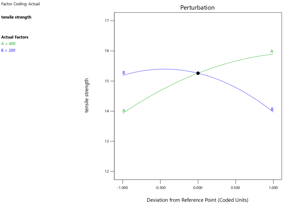 The strong agreement between the predicted and actual tensile strength values was also confirmed by the predicted vs. actual plot (fig. 2a). The perturbation plot (fig. 2b) provides insight into the effect of varying each factor while keeping the others constant. From this plot, it is evident that polymer concentration (A) has a more significant effect on tensile strength compared to plasticizer concentration (B), as the curve for polymer concentration exhibits a steeper slope. In contrast, the curve for plasticizer concentration is relatively flat, suggesting that the tensile strength is less sensitive to changes in plasticizer concentration.