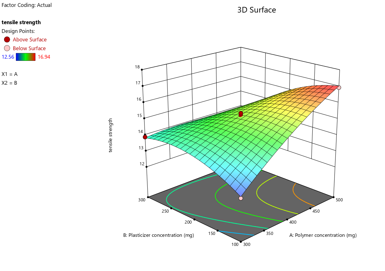 The three-dimensional (3D) response surface plots (fig. 2c) further elucidate the interaction effects between polymer and plasticizer concentrations on tensile strength. These plots highlight a clear interaction between the two factors, with tensile strength showing a peak in the response surface at specific levels of polymer and plasticizer concentrations. The curvature observed in the plots indicates a nonlinear relationship, emphasizing that both factors must be optimized simultaneously to achieve the desired tensile strength.