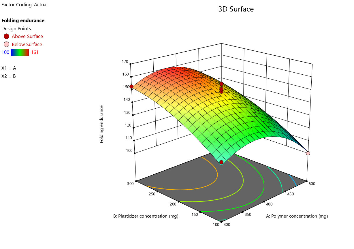 The quadratic terms for both polymer concentration (A²) and plasticizer concentration (B²) were also significant. The A² term, with a sum of squares of 1905.41 and an F-value of 108.07 (p-value<0.0001), indicated that polymer concentration had a nonlinear effect on folding endurance. Similarly, the B² term contributed 254.63 to the sum of squares with an F-value of 14.44 (p-value = 0.0067), confirming that plasticizer concentration also exhibited a nonlinear effect on folding endurance.