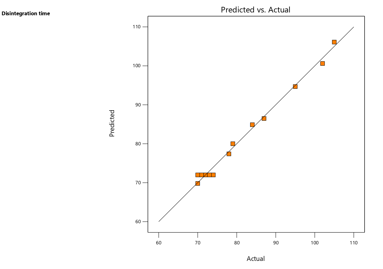The predicted vs. actual plot (fig. 4a) confirmed the robustness of the quadratic model, as the data points aligned well with the regression line, indicating reliable predictions of disintegration time. The perturbation plot (fig. 4b) showed that both polymer and plasticizer concentrations had significant effects on disintegration time, with a steeper slope for polymer concentration, which aligned with its greater impact in the statistical analysis. The 3D-response surface plots (fig. 4c) further illustrated how variations in polymer and plasticizer concentrations influenced disintegration time. These plots revealed that higher polymer concentrations led to longer disintegration times, while plasticizer concentration had a more moderate impact, further confirming the findings from the ANOVA.